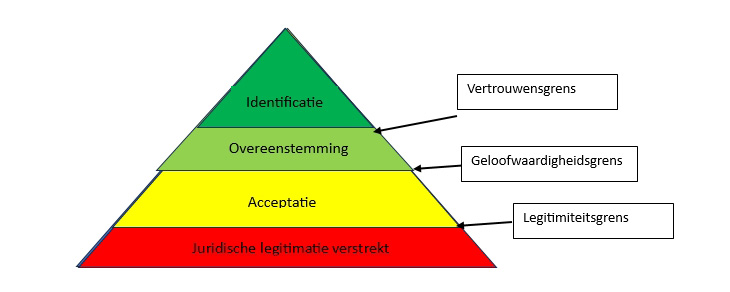 In het geval dat Levitt beschrijft, kunnen we al waarnemen dat mensen en organisatie verschillende opvattingen hebben over wat sociaal acceptabel is. Het is mogelijk dat voor een organisatie juridische legitimiteit ontbreekt, terwijl een afdoende groep belanghebbenden het bestaan van de organisatie mogelijk maakt. Hieruit wordt meteen duidelijk dat elke organisatie die juridische grenzen van legitimiteit nadert of overschrijdt, elke dag het risico loopt te worden opgeheven. Als wordt voldaan aan de juridische eisen kan de organisatie voortbestaan, maar zelfs dan is het geen wet van meden en perzen dat de organisatie overleeft. De organisatie kan dat slechts als een afdoende contingent belanghebbenden haar accepteren. Dat zijn onder meer (potentiële) eigenaren, leveranciers en afnemers. Zij dienen de prestaties en toewijding van het bedrijf te geloven om de producten/diensten/informatie van de betrokken organisatie te accepteren. Pas op het moment dat er sterke overlap bestaat tussen de doelen van de organisatie en die van de belanghebbenden, is er sprake van vertrouwen in de organisatie, waarop identificatie volgt als de ideeën van het bedrijf totaal overlappen met die van de belanghebbenden.
