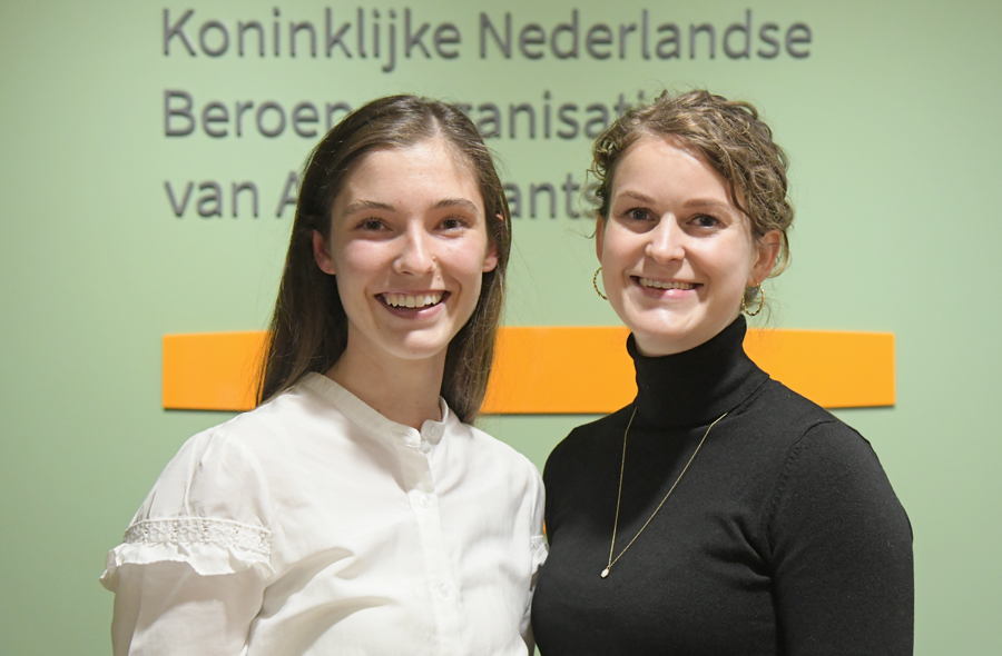 De twee studenten met deze nieuwe aantekening, Fiona Schouten (rechts) en Carlijn de Block, zijn beide werkzaam bij EY. Tijdens hun mondelinge slotexamen werden zij onder meer over de controle van duurzaamheidsrapportages bevraagd door examinatoren Nees de Vos en Ivan Hagenbeek.