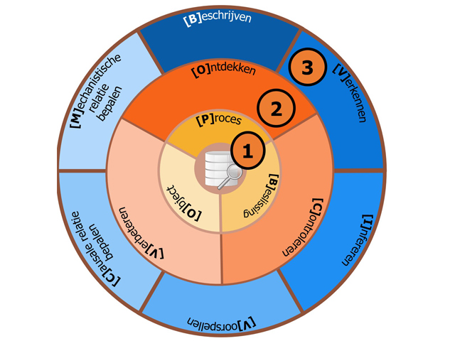 Het model begint altijd in de binnenste cirkel, waarbij de vraag wordt gesteld welke object er geanalyseerd moet worden: een proces, beslissing of object? Wanneer er wordt gekozen voor een procesanalyse, dan wordt aanvullend de vraag gesteld wat je wilt analyseren met betrekking tot dit proces (tweede ring). Wil je een proces voor het eerst ontdekken, wil je het controleren tegen een vastgestelde norm, of wil je een proces verbeteren? Als dit bepaald is wordt naar de derde ring gegaan, waarin je de mate kunt bepalen waarin je het gewenste (bepaald in de eerste twee ringen) kunt meten.