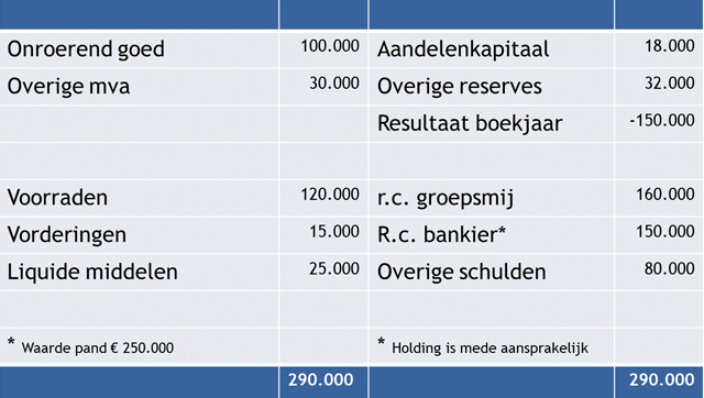 Voordat de holding wordt aangesproken door een schuldeiser van de deelneming, zal deze schuldeiser eerst het mogelijke moeten doen om de vordering bij de deelneming geïncasseerd te krijgen. De deelneming kan niet zomaar worden overgeslagen. In het voorbeeld heeft de bank bij de financiering van de deelneming de eerste hypotheek op het onroerend goed en verpanding van de overige materiële vaste activa én voorraden bedongen. De holding zal hierdoor niet aangesproken worden, omdat de bank bij de deelneming haar vordering zal binnenhalen door deze zekerheden in te winnen. De holding komt dan niet toe aan het vormen van een voorziening!